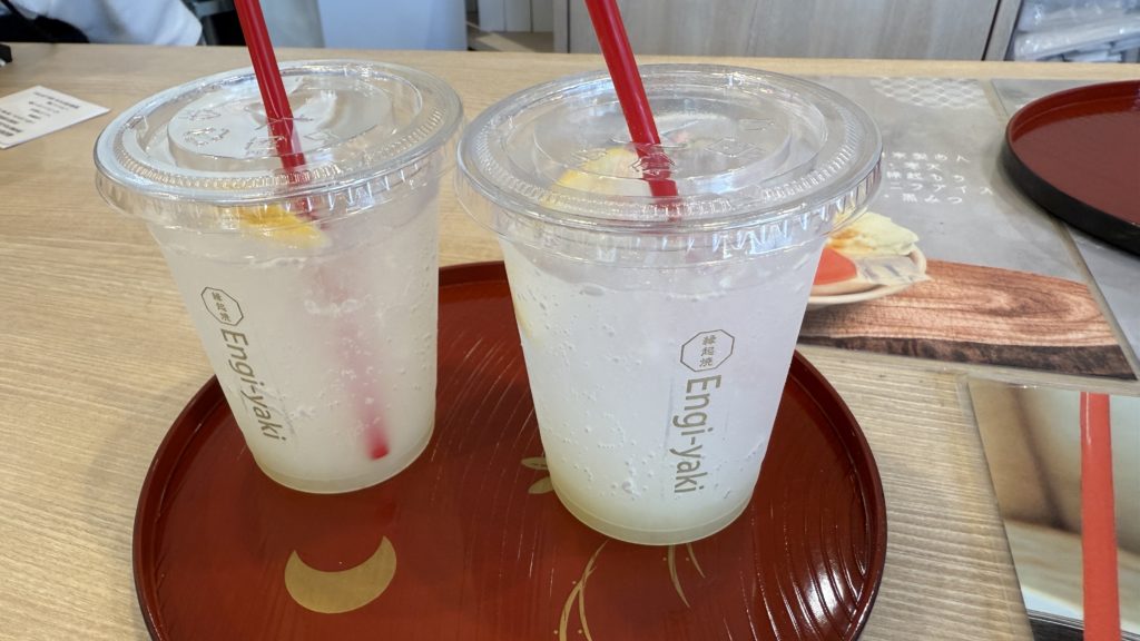 駐車場まで歩くと暑すぎて喉が渇いたのでたまたま見つけた「縁起焼き 本家」さんでレモネードと縁起焼きを買ってみました。